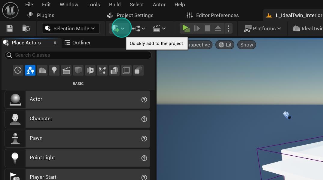 In the editor tab bar we can find the menu to add actors inside the scene.
